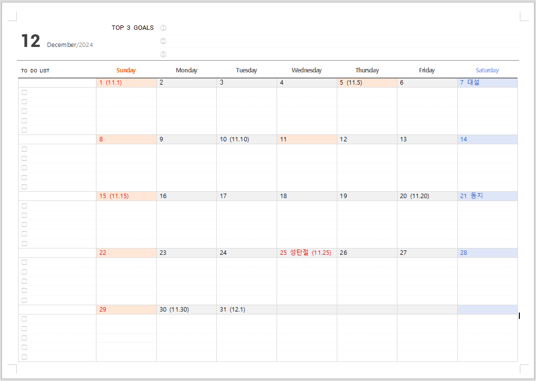 2024년 12월 달력입니다. 12월에는 크리마스마스와 연말연시 행사, 내년 계획 등으로 분주한 달입니다.