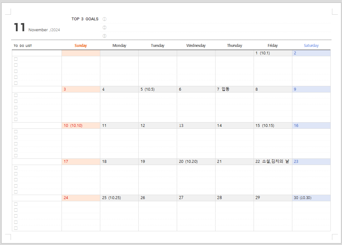 2024년 11월 달력입니다. 11월에는 입동이 있습니다. 11월부터는 점점 추워집니다. 그리고 김장이 시작되는 달입니다.