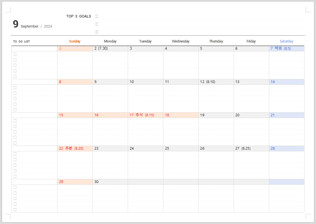 2024년 9월 달력
