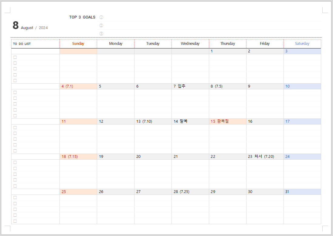 2024년 8월 달력입니다. 8월 15일 광복절을 맞아 태극기를 달아주세요. 8월에는 입추로 가을이 들어 오는 달입니다. 이달 말복도 있어 늦여름 초가을입니다.
