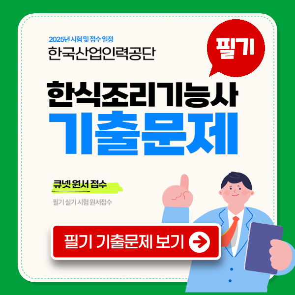 한식조리기능사 필기 기출문제 다운로드는 아래 사이트에서 한식조리기능사 필기시험 기출문제를 다운로드하거나 온라인에서 풀어볼 수 있습니다.