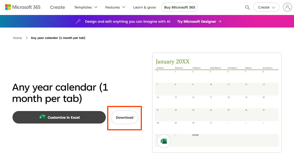 1) 마이크로소프트 달력 탬플릿 페이지에 접속한 후 다운로드 버튼을 눌러 엑셀 달력을 다운로드합니다.