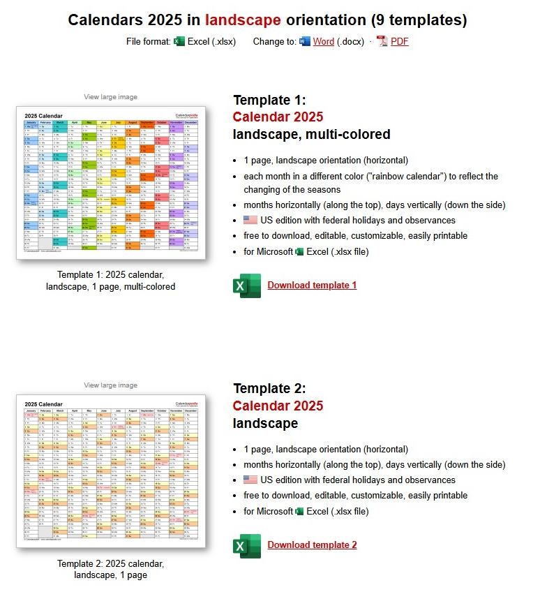 영문 엑셀달력을 제공하는 해외 템플릿 사이트에서도 회원가입없이 2025년 엑셀달력을 다운로드할 수 있습니다. 바로 calendarlabs.com이라는 사이트입니다. 여러가지 형식의 엑셀달력을 제공하고 있어 맘에 드는 달력을 무료로 다운로드할 수 있습니다.