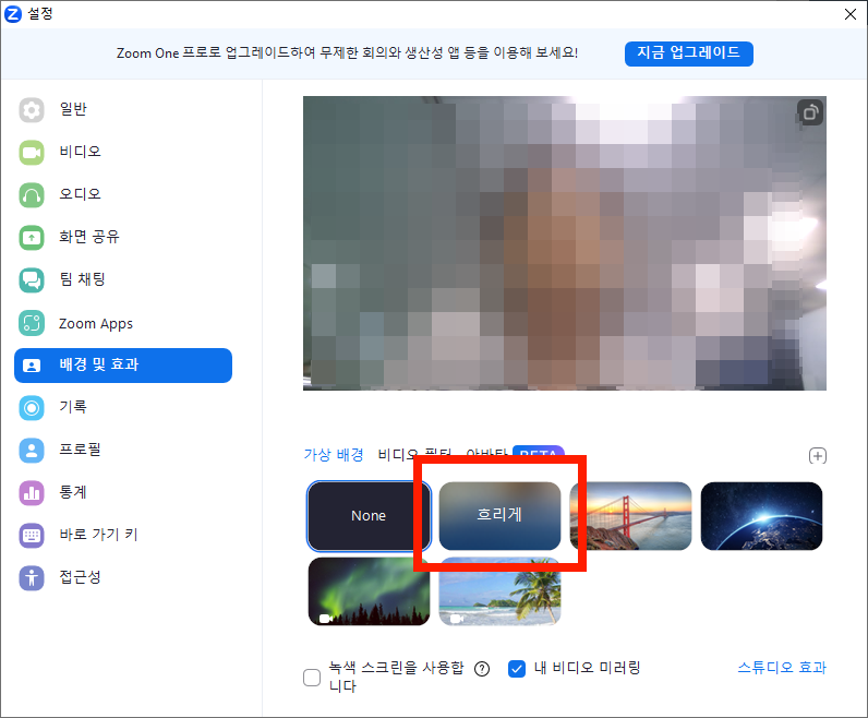 아래 사진처럼 가상 배경 항목에서 흐리게를 선택하면 화상회의 배경화면을 흐리게 수정할 수 있습니다.